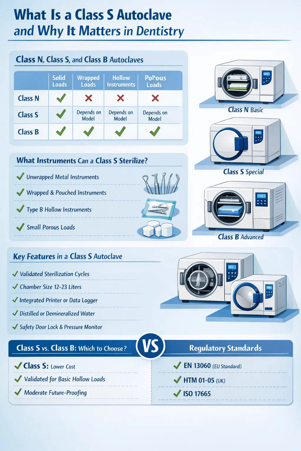 Un'autoclave di Classe S è uno sterilizzatore a vapore progettato per gestire una gamma di carichi specifica, definita dal produttore, che si colloca tra la Classe N di base e la Classe B pienamente capace in termini di prestazioni di sterilizzazione. Nello studio dentistico, l'autoclave di Classe S è una delle unità di sterilizzazione più comunemente utilizzate , perché offre un equilibrio pratico tra costo, velocità del ciclo e capacità di trattare strumenti cavi e porosi che sono standard in qualsiasi clinica odontoiatrica.