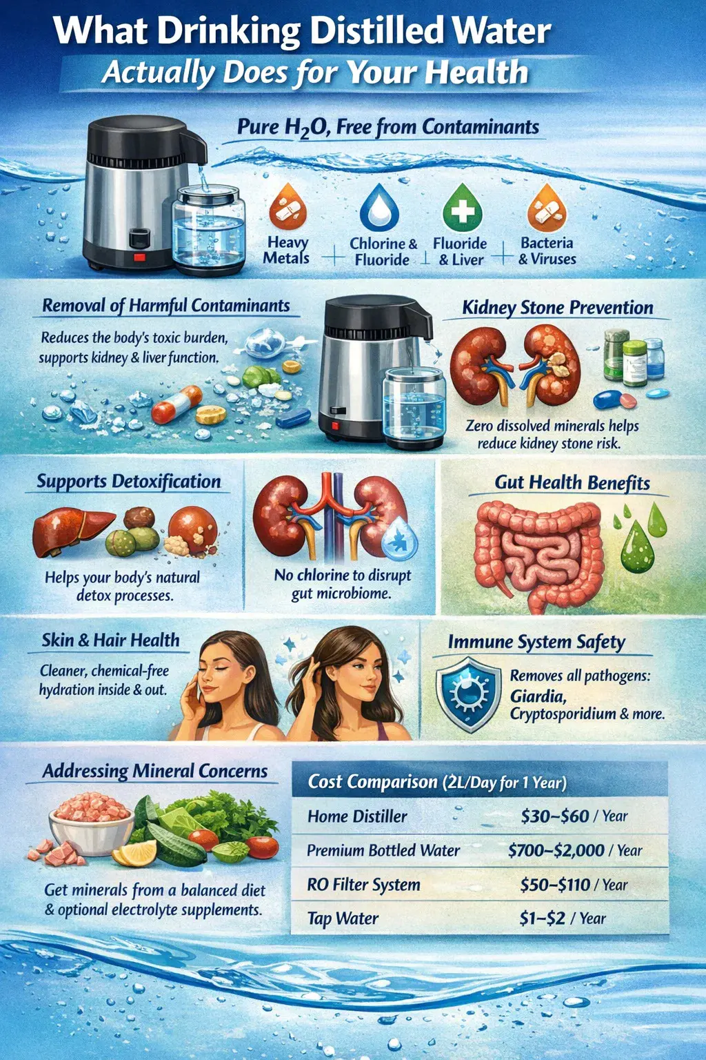 I benefici per la salute derivanti dal bere acqua distillata sono reali, ma sono principalmente benefici derivanti dall’assenza di contaminanti, agenti patogeni, minerali indesiderati e additivi chimici. Questa non è una cosa da poco. Dato che la persona media consuma all'incirca 700–1.000 litri di acqua all'anno , la differenza cumulativa tra acqua costantemente pulita e acqua contaminata nel corso della vita è significativa.