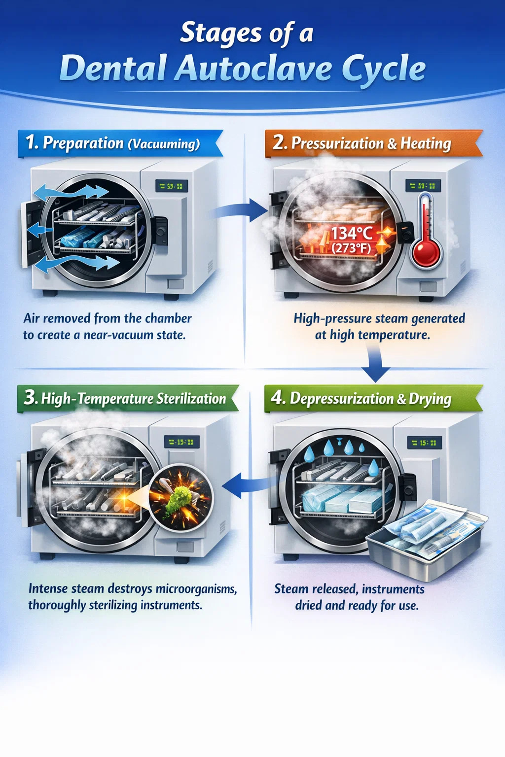 Le autoclavi dentali, in termini semplici, funzionano come una versione aggiornata di una pentola a pressione domestica. Utilizzano una combinazione di alta temperatura, alta pressione e vapore per eliminare completamente i contaminanti microscopici dagli strumenti chirurgici.