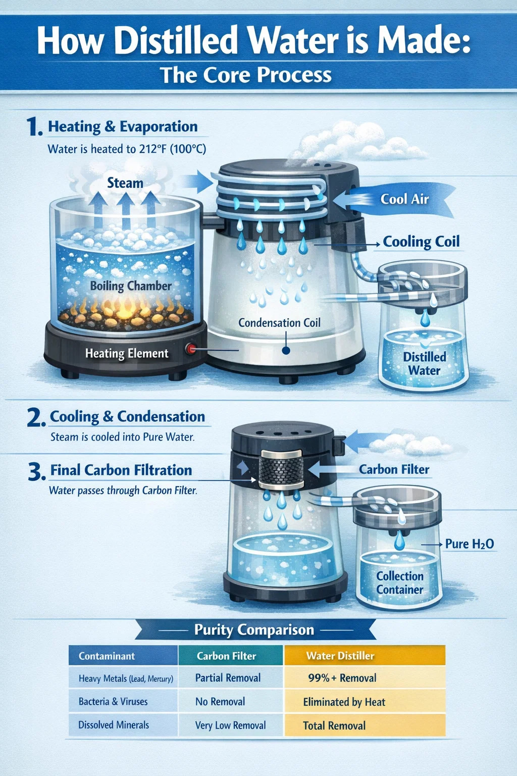 Il processo inizia quando la camera di ebollizione del distillatore d'acqua è riempito con acqua del rubinetto. Un elemento riscaldante elettrico alla base aumenta la temperatura a 212°F (100°C) . Quando l'acqua raggiunge il punto di ebollizione, si trasforma in vapore. I gas volatili possono essere rilasciati attraverso uno sfiato, mentre i contaminanti non volatili come piombo, arsenico e fluoruro rimangono intrappolati nel serbatoio di ebollizione.