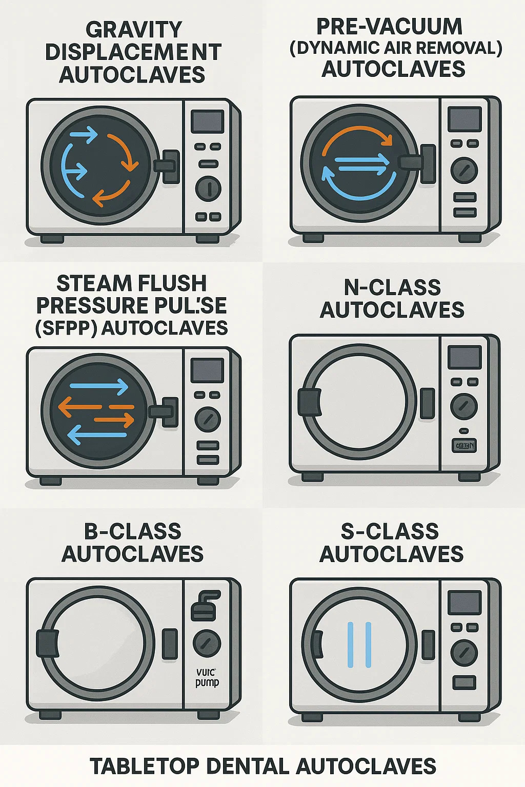 | Spostamento di gravità | Il vapore spinge fuori l'aria per gravità | Strumenti solidi (pinze, bisturi) | Piccole cliniche con strumenti di base |