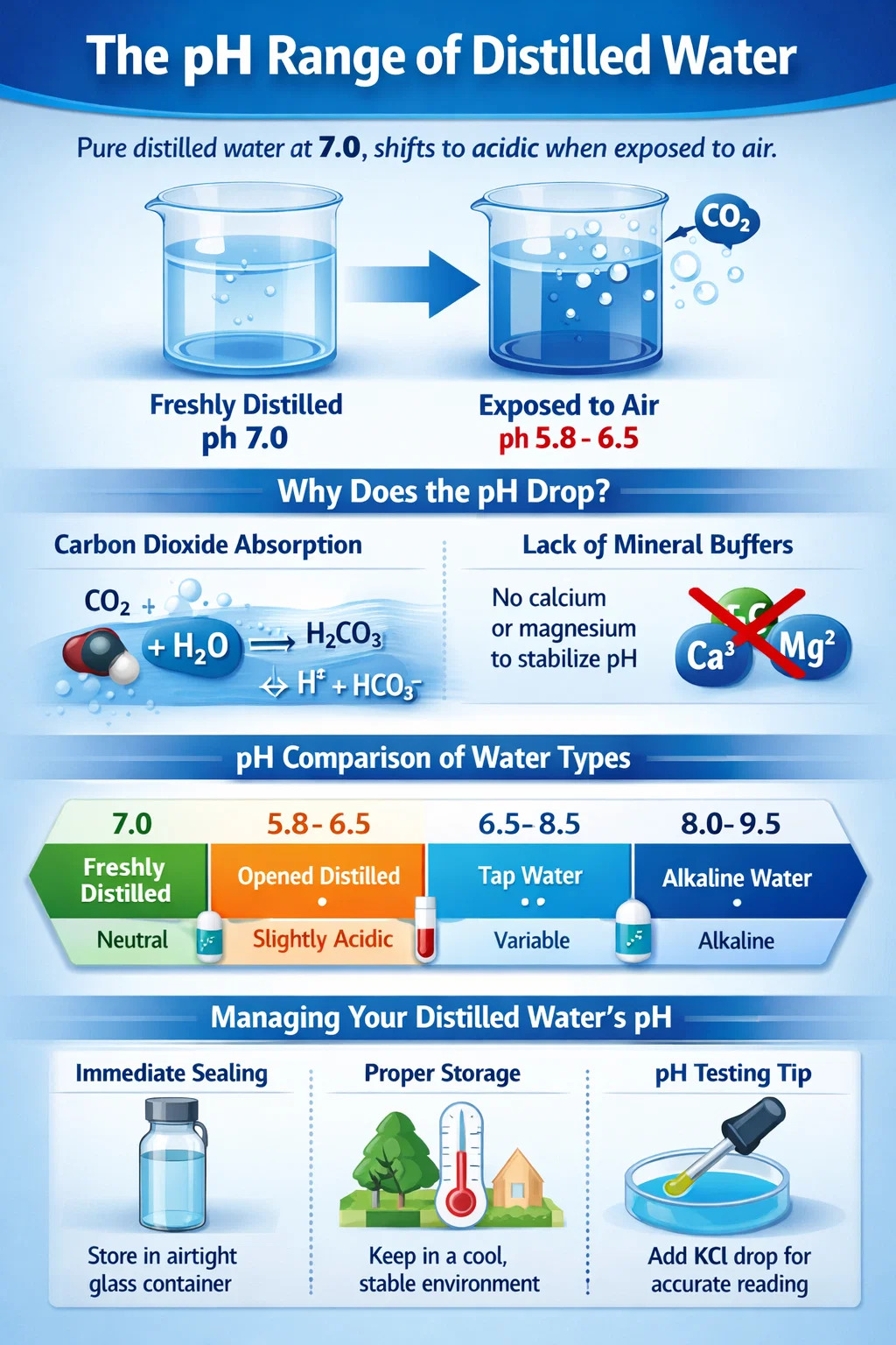 La solubilità della CO2 aumenta man mano che l'acqua si raffredda. L'acqua appena distillata è spesso calda; quando raggiunge la temperatura ambiente, assorbirà il gas più rapidamente. Mantenere il contenitore per la conservazione in un ambiente stabile e temperato aiuta a prevenire drastiche fluttuazioni del pH .