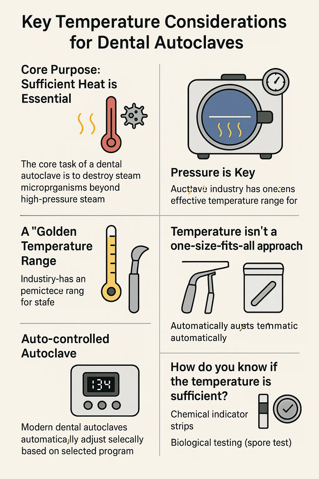 Attraverso la pratica a lungo termine, l’industria dentale ha identificato un intervallo di temperature universalmente accettato ed efficace per la sterilizzazione.